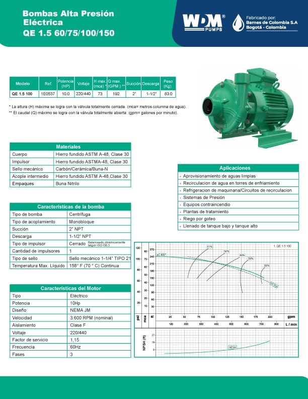 Fichas-tecnica Electrobomba Alta Presión de 10HP 220/440V 2″ X 1-1/2″ Barnes 1E0537 QE-1.5-100-min