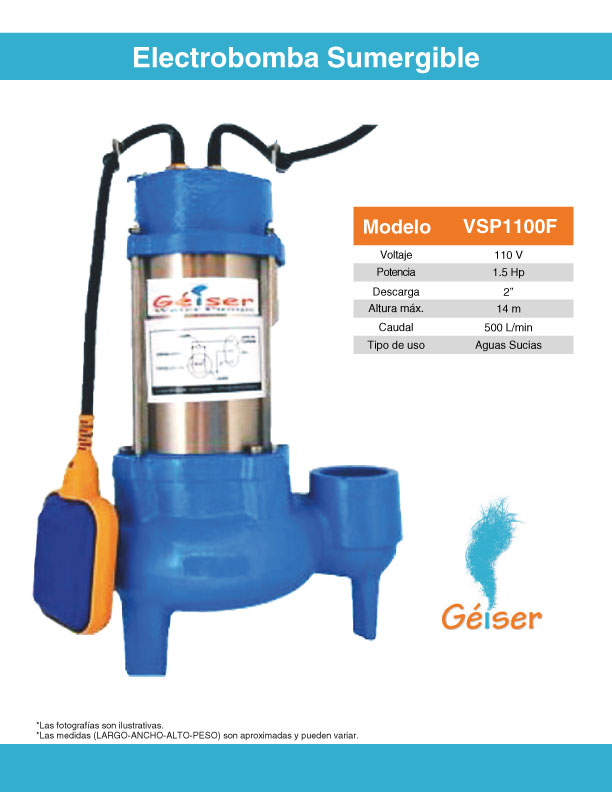 Electrobomba Sumergible 1.5Hp Aguas Sucias Géiser VSP1100F