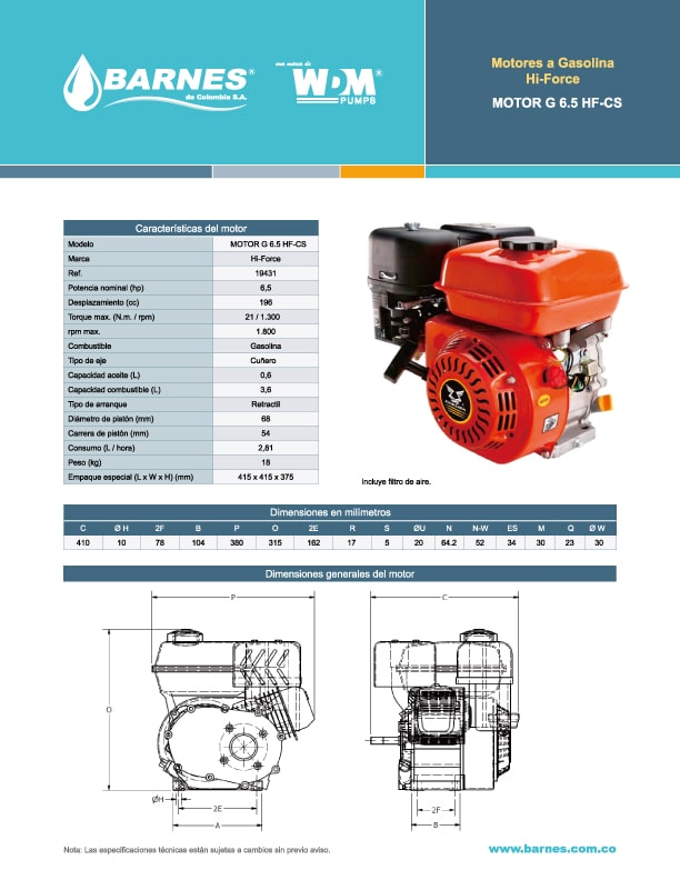 FICHA-TECNICA-Motor a Gasolina De 6.5HP 3600RPM Embrague Cuñero Barnes 19431